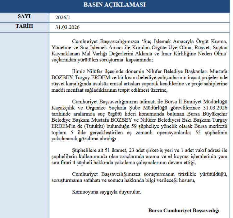 Bursa Cumhuriyet Başsavcılığı’nın yürüttüğü soruşturma kapsamında 4 ilde eş zamanlı operasyon düzenlendi. Aralarında Bursa Büyükşehir Belediye Başkanı Mustafa Bozbey’in de bulunduğu 59 şüpheli gözaltına alındı.